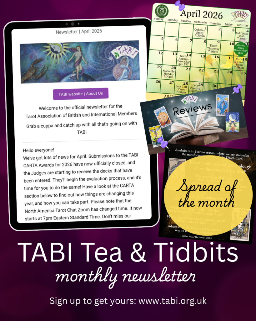 Wonder what we’re up to? The Menu in the top bar will take you to details of our upcoming monthly workshop events and our summer conference in York, which are open to everyone; the menu will also take you to the membership page where you can find out about all the amazing benefits of joining TABI, including beginner’s and intermediate tarot training, Endorsement Training, access to one (or all) of eight monthly Zoom chats, and more.Â