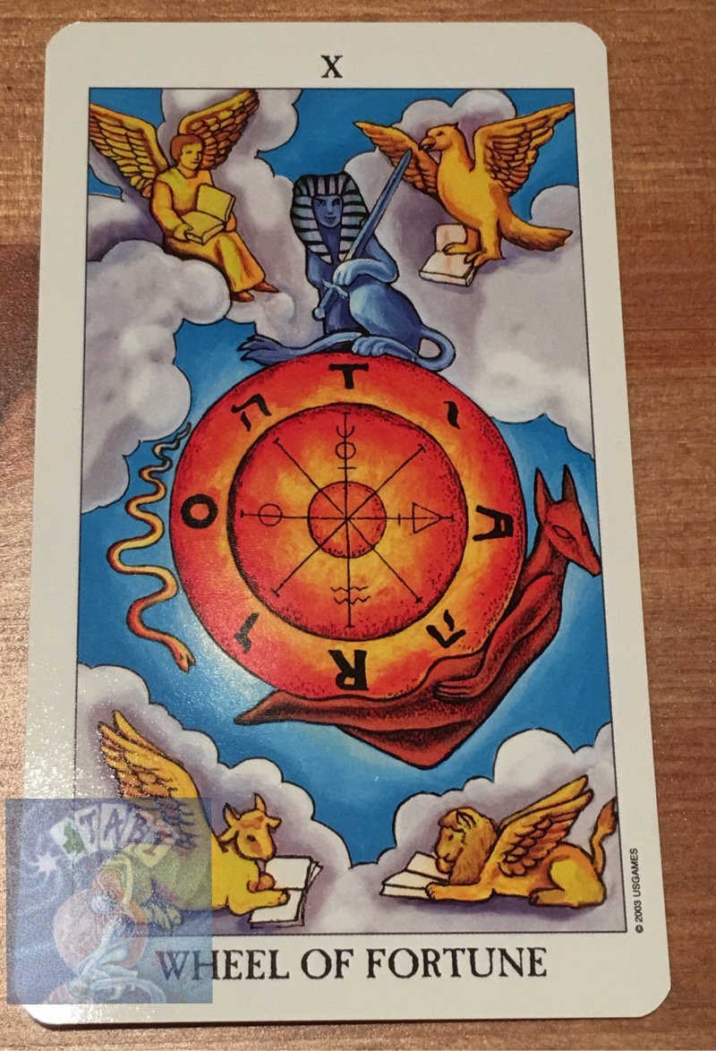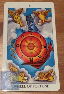 Round and round and round it goes and where it stops, nobody knows….I’m recalling the catch phrase from the TV show ‘Wheel of Fortune’ here. The game was won or lost on a turn of the wheel. Which makes me think of other games of chance. As the card is in the upright position it does carry a healthy dose of good luck with it – if you’re so inclined, why not have a flutter on the lottery or something similar this month? Or maybe, if you’ve been wondering whether to try something, take the chance. Nothing ventured, nothing gained – you may just get lucky, providing you’ve been nice, because remember what goes around, comes around…..