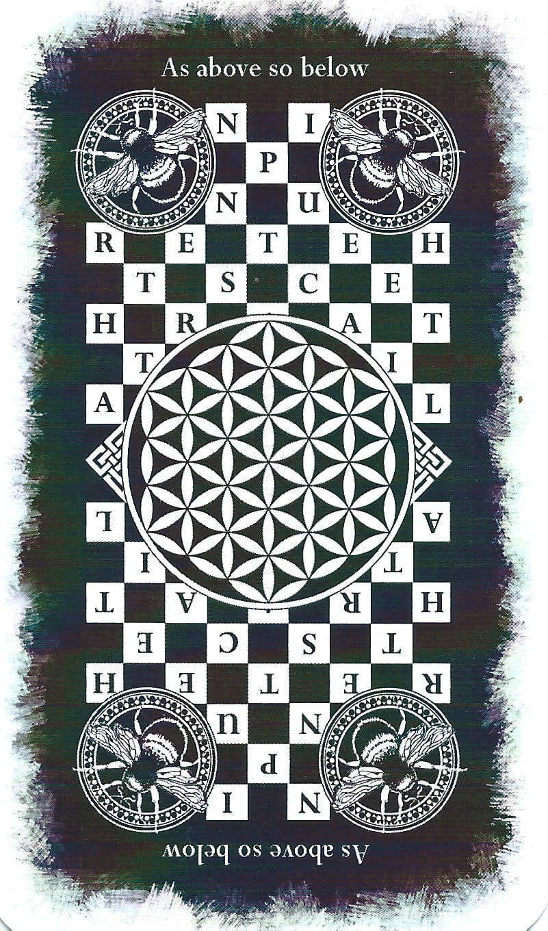 The cards measure 12cm x 7cm on good quality cardstock. Beautifully smooth and easy to shuffle. They come in a tuck box with a simple, contemporary design (see top photo). The card back shows a checkerboard and Flower of Life design with industrious bees in each corner.