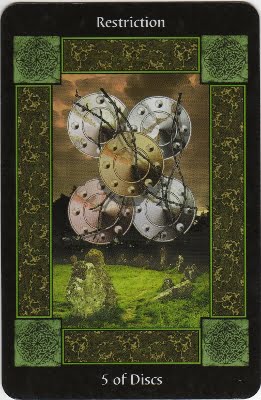I look at the card and see the discs being held back by barbed wire things look heavy in the air, like a storm might be coming or darkness and there is a feeling of progress being blocked.