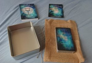 The limited edition comes in an elegant silver tin with an image from the Ace of Cups on the front.  Inside are a card signed by the creator showing which number in the limited edition the deck is (mine is 40/100), a guidebook, and the cards themselves in a jute tarot bag with silver threads running through it. The jute is rough to the touch and seemed an odd choice for a deck that otherwise has quite an ethereal vibe to it, but no doubt it is more environmentally friendly than other options.