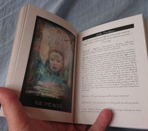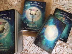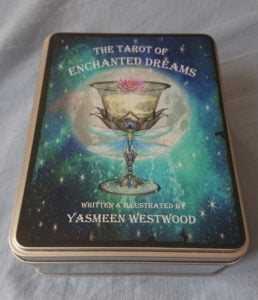 The Tarot of Enchanted Dreams with art and text by Yasmeen Westwood was a joy to receive right from the time I opened the package.  My review copy is one of the self-published limited edition, which is now sold out – but the deck has been taken up by a Tarot publisher, so a wider edition will follow.