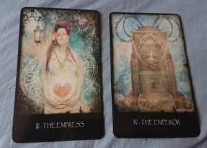 Rather, the Emperor and King cards show empty thrones and the Knight cards an empty medieval helmet, whereas the Empress, Page and Queen cards show actual women. As I strive to maintain a dynamic equilibrium of masculine and feminine energies in my own practice, I found this imbalance rather offputting, but it would suit readers and querents who prefer to focus on the feminine. I would also have preferred to see a greater variety of ethnicities, body shapes and gender presentations.