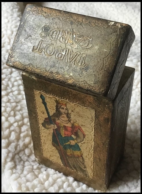 Then a few weeks later in Stockport, in a dusty little bookshop on Wellington Road, I was thrilled to spot a box specifically for my new deck. It was gilded wood with a copper-hinged lid, the legend “Tarot Cards” inscribed on the top and a picture of the King of Wands “Roi des Batons” on one side, and the Queen of Wands “Reine des Batons” on the other. There was only that box in the shop and the bookseller said he didn’t know if he would ever have another. I, for one, have never seen its like to this day.