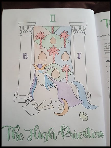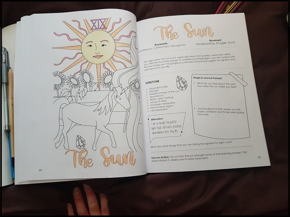 In summary, for each Major Arcana card there is a picture, keywords (including for reversals), a brief description of the card meaning, the associated crystal and it’s properties, an affirmation, journal prompts, and a Unicorn action.