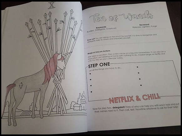In case it’s not clear, I’m excited to be working through this book and think it’s a great introduction to tarot. As one of my friends stated on seeing the 10 of wands, “why is that Unicorn trying to carry so many lances?” The meaning of the card is being over-burdened and the keywords are “burden, delegate, overload”. I congratulated him on his first (to my knowledge) interpretation of a tarot card! This book is a fabulous resource to be added to any beginner’s toolkit. I wonder if the journaling and actions would appeal to more experienced readers.