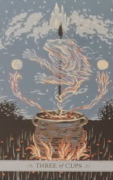 My first actual reading was a revelation. I asked what I needed to know about a friend who was in dire straits, a long way from home, and the card that leapt out was the Three of Cups. In common with many of the other images in the deck, this one bears no resemblance to the corresponding Rider Waite Smith version. It depicts a cauldron of bubbling liquid whose steam forms into the shape of a lion. Behind the animal arises a spear which points to a turreted castle in the sky. More steam leads toward a distant sun and a moon on either side of the main scene. Quite different from the RWS cabal of three women holding goblets aloft, although the guidebook does follow some traditional meanings.