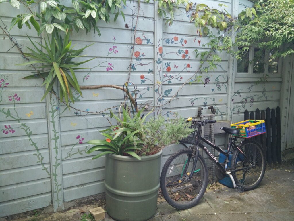 I also spent, like many people, an awful lot of time in my garden. With the weather being so good and having the excuse to spend all day outside, I finally tackled some of those jobs that I had been meaning to do for ages. One day I had an idea about the side of the garage wall. There is no soil, just concrete slabs and the gap between garage and pathway to garden is not very wide. I do have one very large tub with a climber, but the walls looked very bare. Painting is something I have an interest in too, so I got out my acrylic paints and some stencils. Using the stencils to start with, although I eventually painted everything free hand, I painted sweet peas, roses & wisteria all growing up the garage wall. I won’t get any prizes for artistic quality, but from a distance it looks quite good!