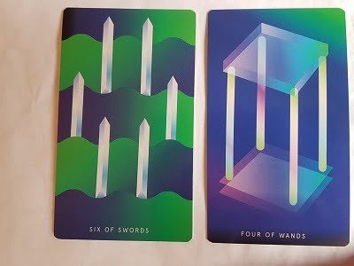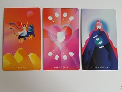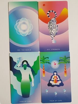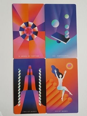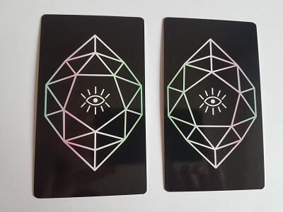 This is my first glossy deck, so the concept is new to me: very shiny and reflective which I like, although it’s made taking photos of them difficult. A few of the cards were stuck together during the initial flick through. They easily separated (like things held together with static) and sometimes they still get attached to each other. Also, as is usual for me, the backs are non-reversible. It’s subtle so you could miss it – for ages I thought the colouring was more of the holographic effect.