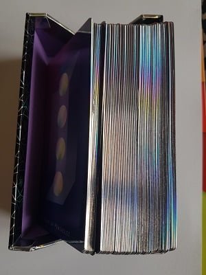 I adore this deck. The book is the same height and width as the cards, and they all fit into the sturdy box. The holographic effect on the box edge is the same as the card edging. I fell instantly in love. (The card you can just see in the photo showing the edges is the 4 of pentacles).