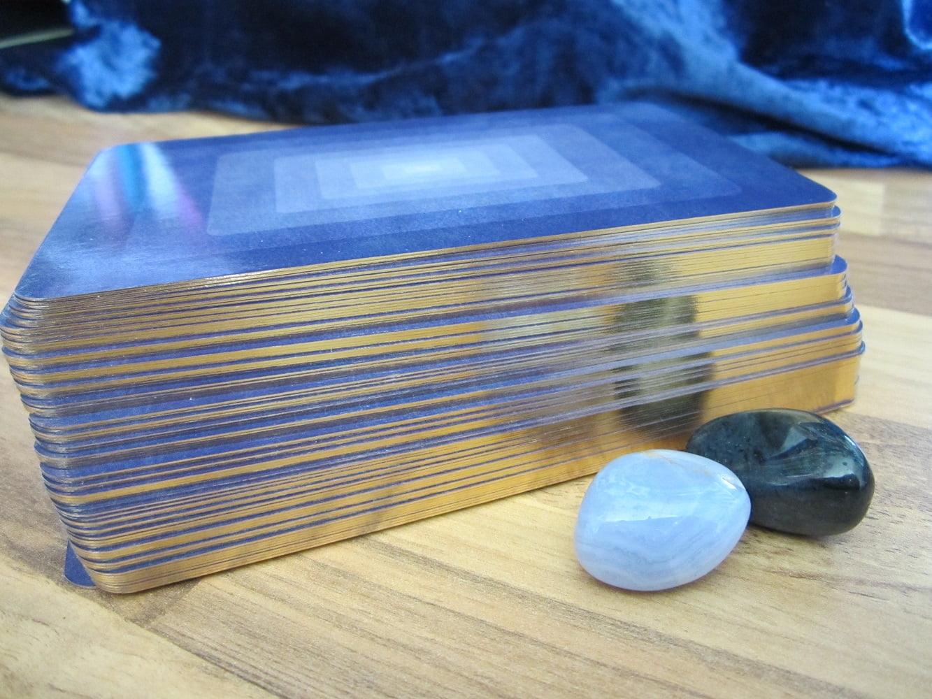 The cards themselves are of a fine quality card stock and are pretty large, measuring 13.3cm x 8cm. They’re deliciously glossy with denim-blue backs and gilded edges that gleam like a mirror. I’ve included a couple of stones in the picture to show just how phenomenal the golden shine is.
