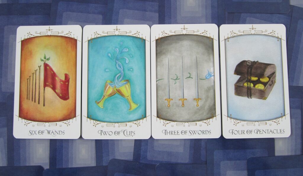 Insight Tarot 6 of Wands, 2 of Cups, 3 of Swords and 4 of Pentacles
