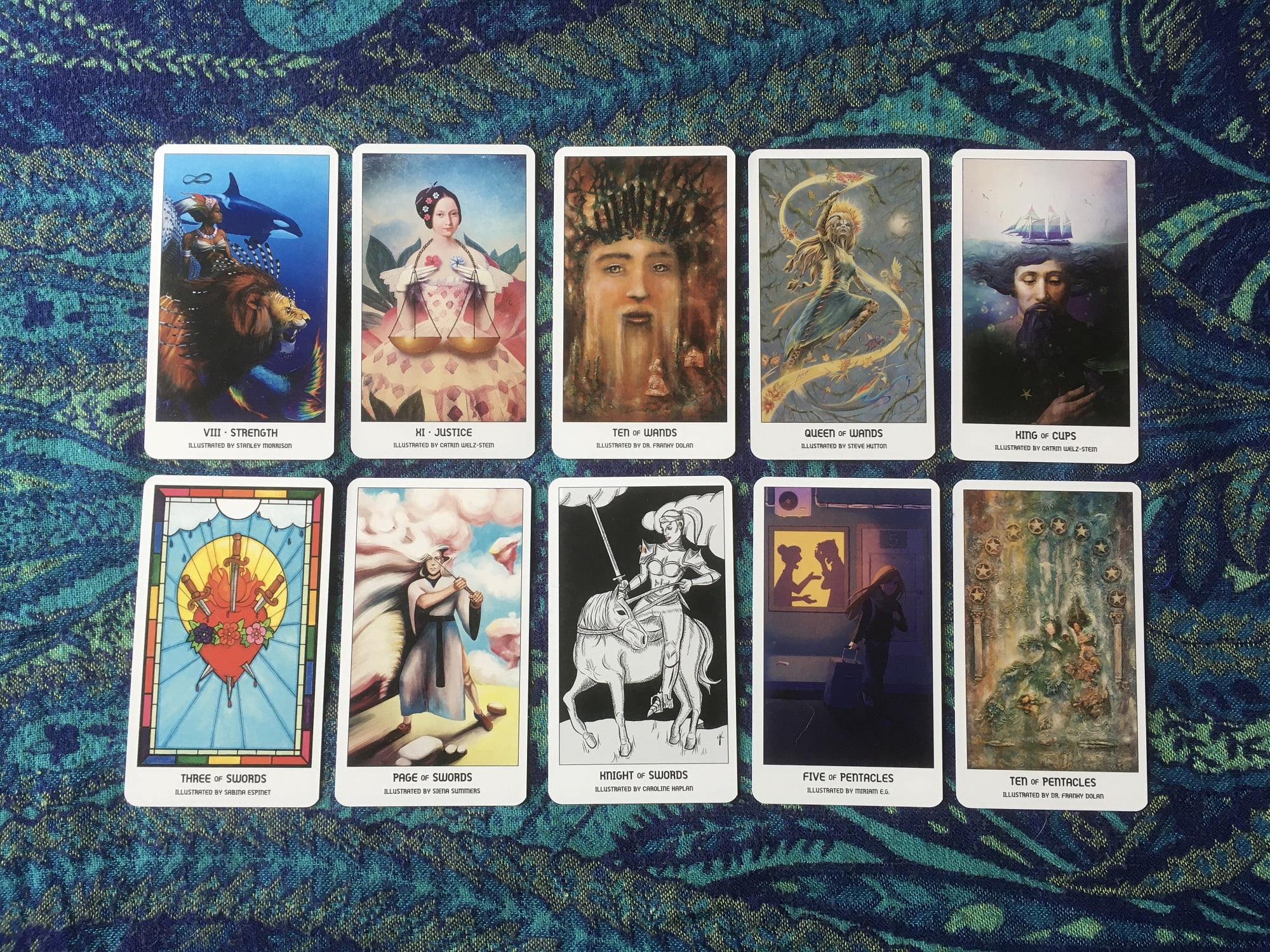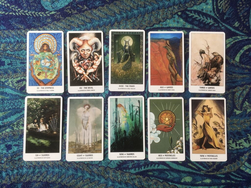 Those of you familiar with Next World Tarot will recognise a few cards in this collection. I was a little disappointed not to have new art from Cristy C. Road (but that’s just me being greedy). After looking at the deck in more detail, I realised that there are further cards included from already-published decks: Two of Swords is from the Deviant Moon Tarot, and Four & Ten of Cups are from the Urban Tarot. There is no mention of this in the guidebook which feels a huge oversight to me.