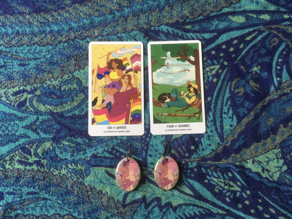 It was a total joy to find Moomie Swan’s artwork in this deck (I got a pair of her The Lovers earrings a year ago and they quickly became a favourite) – a delight to get a preview of her upcoming Sapphic Magic Tarot deck.