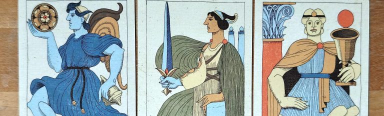 The Triumphs all have titles to give you clues to their meaning, as does each card in the Creative Suits, e.g., the 10 of Poetry (the Earth suit) is ‘Prophecy’ and the 8 of Music (Fire) is ‘Discontent’. The Court Cards are Angel, Child, Woman, and Man.