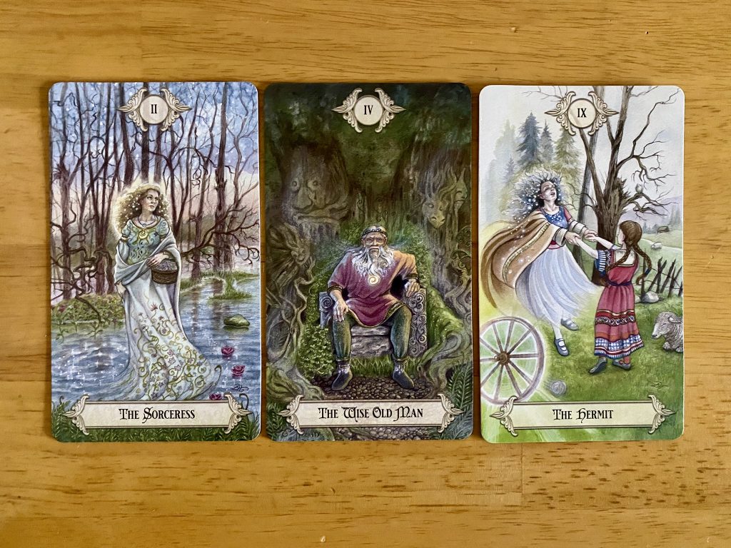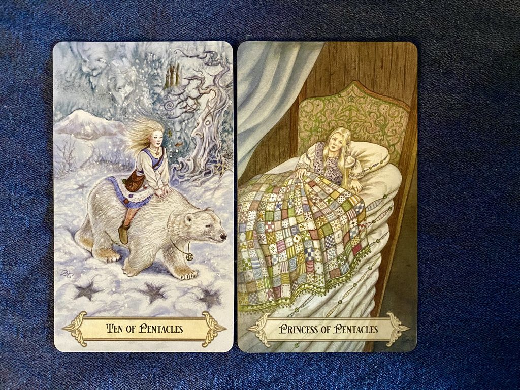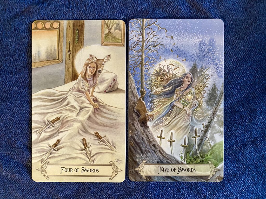 Let’s look at the Four of Swords, for example. This depicts a story unfamiliar to me: The White Doe (French cultural origin). The image is a girl partially transitioned into a deer, lying in bed, the four swords around her, and a window and a hanging key in the background. There is discoloration on the sheets, meant to indicate blood seeping through from her feet. Each aspect of the image and its relation to the card meaning is explained in the guide: the deer reflects her “wild but gentle spirit”; the window represents her subconscious wish for freedom; the laying swords represent temporary stability; the blood represents her need to recover following a trying experience in the world; and the key represents her state of transition. There is much more detail depicted in the card and explained in the guidebook. Summarized, the meaning provided is that to solve mental blocks, problems, or the “monkey mind”, it is sometimes necessary to slow down and allow your mind and body to retreat, recover, and regenerate before heading out again.