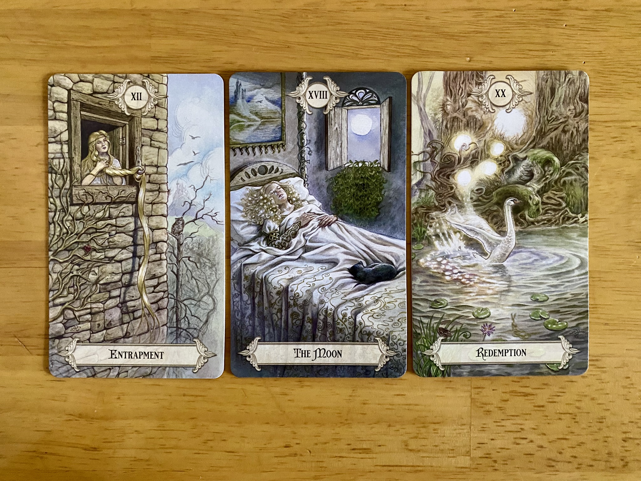 Let’s look at the Four of Swords, for example. This depicts a story unfamiliar to me: The White Doe (French cultural origin). The image is a girl partially transitioned into a deer, lying in bed, the four swords around her, and a window and a hanging key in the background. There is discoloration on the sheets, meant to indicate blood seeping through from her feet. Each aspect of the image and its relation to the card meaning is explained in the guide: the deer reflects her “wild but gentle spirit”; the window represents her subconscious wish for freedom; the laying swords represent temporary stability; the blood represents her need to recover following a trying experience in the world; and the key represents her state of transition. There is much more detail depicted in the card and explained in the guidebook. Summarized, the meaning provided is that to solve mental blocks, problems, or the “monkey mind”, it is sometimes necessary to slow down and allow your mind and body to retreat, recover, and regenerate before heading out again.
