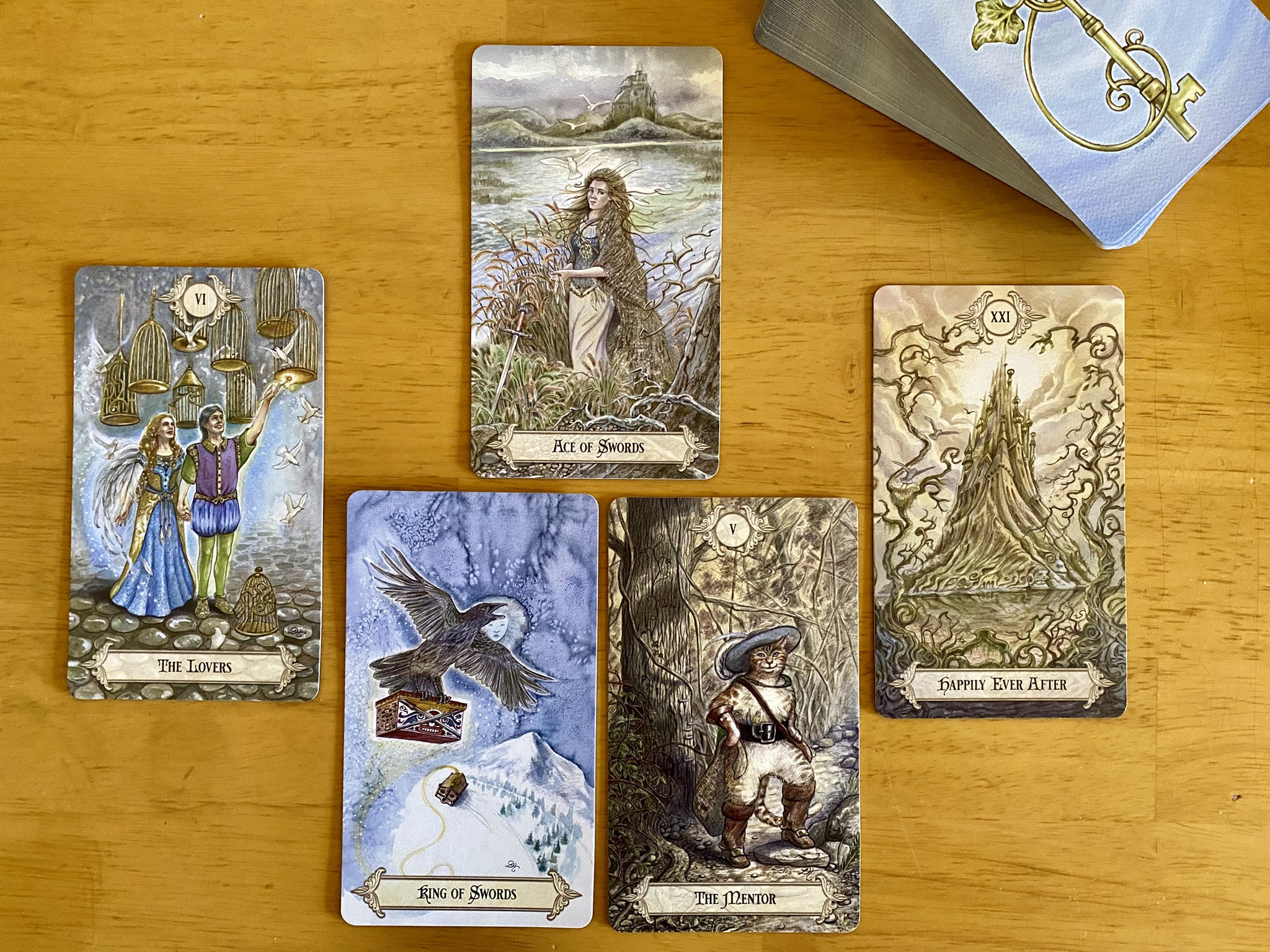 The guidebook is small, yet mighty. Each card description, Major and Minor, has a story and its cultural origin. There have been some name changes in the Major Arcana, including: Fairy Godmother for the Empress; the Mentor for the Hierophant; Entrapment for the Hanged Man; Temptation for the Devil; and Redemption for Judgement, among others. The name changes are all fairly obvious for the seasoned reader, and the changes align well with the theme. The one name change that didn’t work for me was Happily Ever After for The World. I understand the reasoning—Happily Ever After as the familiar ending of fairy tales and The World being the conclusion card of the Fool’s Journey—but I don’t think it is representative of the meaning of the World card. On the other hand, the keywords for the Happily Ever After card are fantastic: self-awareness, wholeness, individuation/integration.