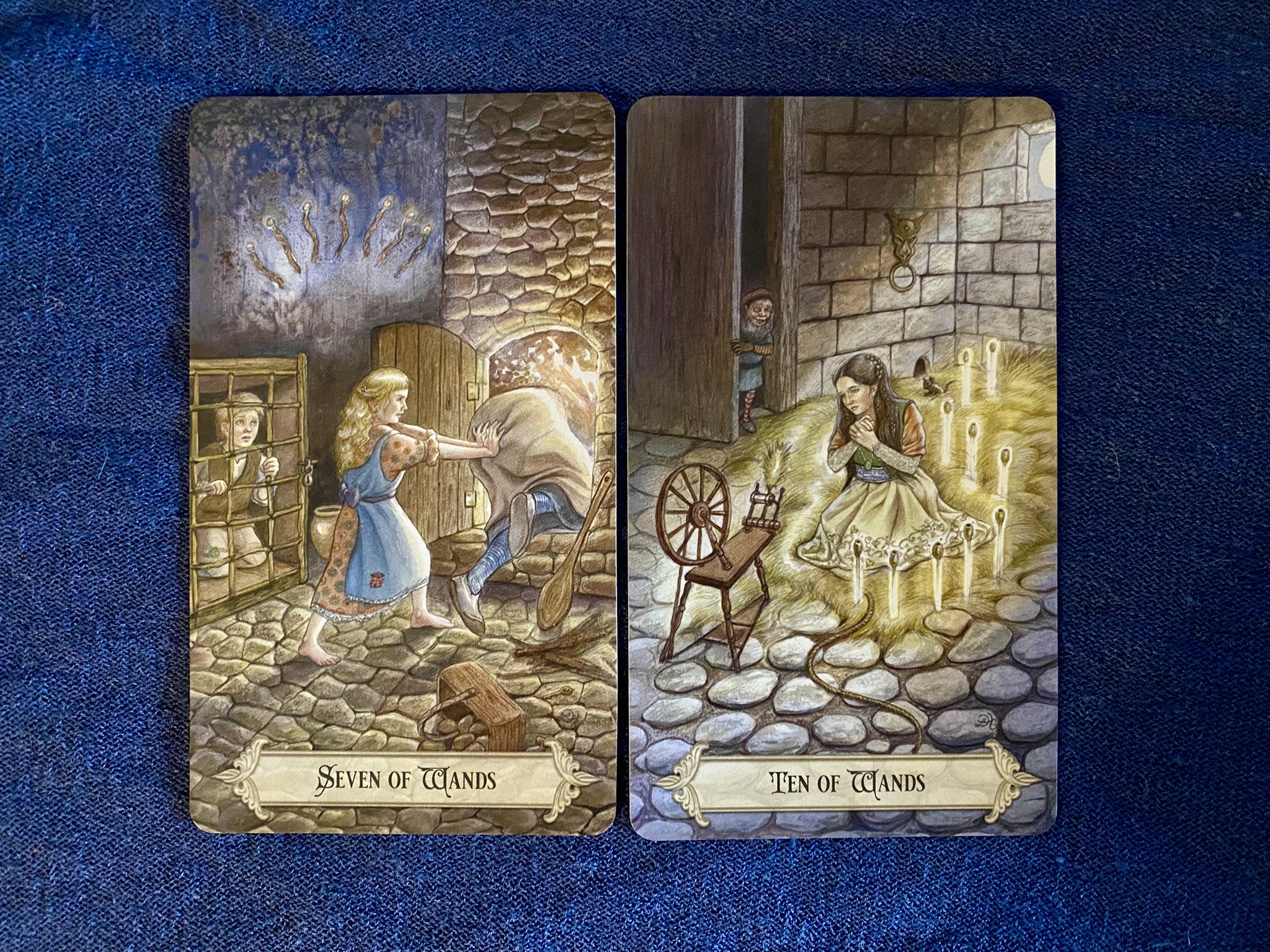 The Seven of Wands features the very familiar tale of Hansel and Gretel (German cultural origin), showing Gretel shoving the witch into the oven while Hansel watches from his place of imprisonment. Every tiny detail of the card is discussed in the guide, concluding with the meaning that courage and quick, resourceful thinking are needed to face your shadows. It is a neat take on the Seven of Wands and fits with the traditional meanings of defending your beliefs, feeling backed into a corner, standing on your own two feet, and resistance.