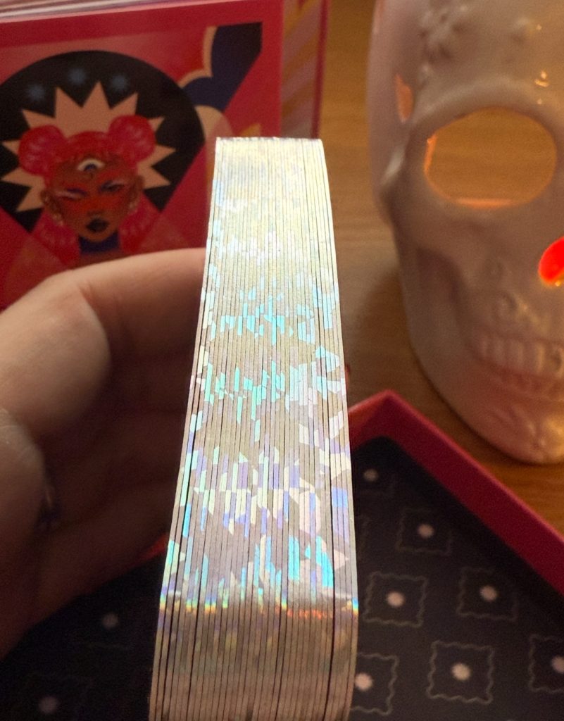 The cards are embossed on the edges with a stunning metallic patterned gilt, they are so glossy that they slide easily when shuffling.