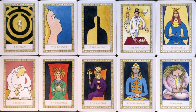 The first decade charts the formative years of self-discovery through guidance. Navigating The Maze (of life) as The Believer recalls aspects of The Magician, just as coming face to face with The Shadow does the same for The Priestess, both of whom are also included as separate entities in this sequence. Split out, too, is The Hierophant, across Cards 6 and 9, from what we are taught to what we learn for ourselves.