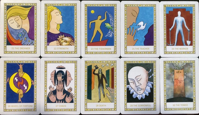 And so from Sleep to The Dreamer and Strength in the 3rd decade, where apart from the physical benefits of rest, our dreams give us courage. I like the juxtaposition of The Fisherman and The Teacher, together recalling the old adage about teaching a man to fish. And on the subject of making a living, The Worker, who calls to mind the 7 and 8 of Pentacles.