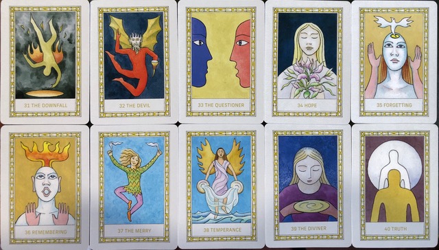 With the talking cure of The Questioner we gain Hope, through which we learn to forgive and forget with Forgetting and its dove of peace. Then the surprise of Remembering, the rising Phoenix of rebirth, which, together with the childlike joy of The Merry, echoes the 6 of Cups.