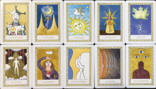 In the 5th decade, The Fool encounters a relation in The Clown, clearly channelling the Yin/Yang nature of the trickster, and pops up again, spirits lifted, in the Nature card. And yet, uncertainty is never far away, and as The Lost, the Fool is found wandering past too many doorways, spoilt for choice or in search of purpose, which he finds through the self-reflection and soul searching of Judgement.