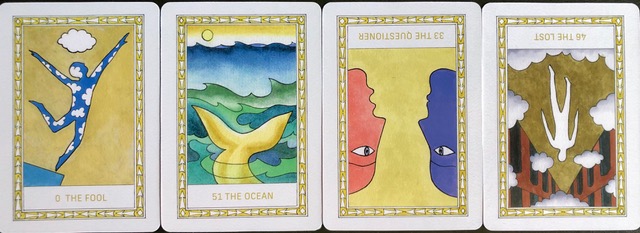 So, I tried a reading, which I found easy enough. Using the Fool as a significator, I pulled 3 cards: Card 51 The Ocean (U), Card 33 The Questioner (R) and Card 46 The Lost (R). Here is a lovely image of The Fool leaping into the unfathomable waters of the Ocean – a much needed tonic for our troubled times. The reversed Questioner, though, asks what are we on the fence about, what fresh lines of inquiry and avenues of thinking are we refusing to acknowledge or engage with? It could also mean, coming after The Ocean, the acceptance of what is, the ebb and flow, the cyclical nature of things, compared to which our own concerns are trivial and petty. The sense of peace that comes with that acceptance is the 3rd card where the reverse of ‘lost’ is ‘found’, discovery and clarity of the bigger picture – back to the ocean – and the knowledge of who you are, where you’re going, and what you seek. Stripped of the traditional Renaissance symbolism, the cards make for an easier, more meaningful, if less mystical, reading.