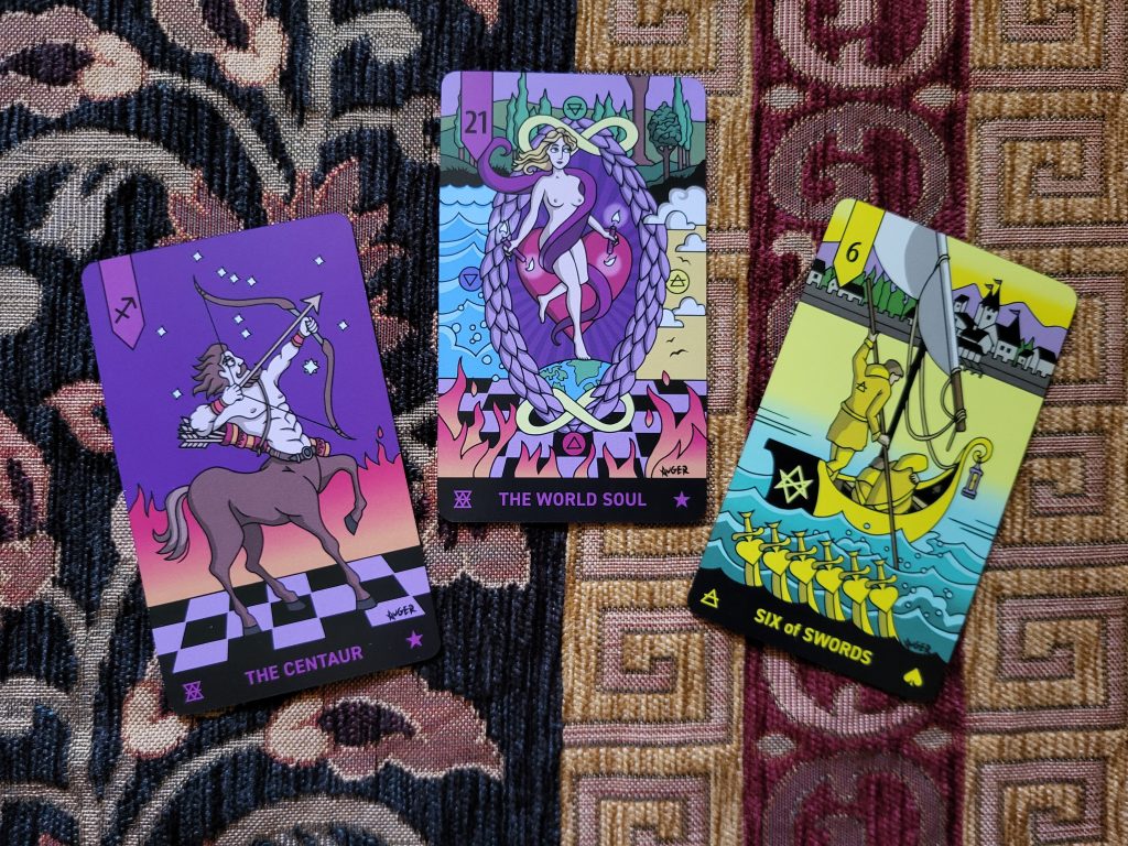 As you might have guessed, I wanted to put this deck into practice. I can usually find someone who has a question, and this time the querent asked “I am currently facing a decision whether to stay or leave my current job role due to conflict in the office…” The cards were straight to the point: The Centaur – channel energy towards solving philosophical problems, a need for freedom and expansion, a love for exploring and wandering the world, ready to show their fiery side if anyone crosses them. The World Soul, (Card 21 of the Major Arcana) signifying a unified connection of universal empathy, celebrate the fulfilment of an objective and successful progress towards new goals. And last of all, the 6 of swords, signifying harmony of thought once a logical decision has been made, and beautiful solace in escaping a negative situation. This would appear to point to a new direction that is on the horizon, although, of course, the querent is free to decide for themselves!