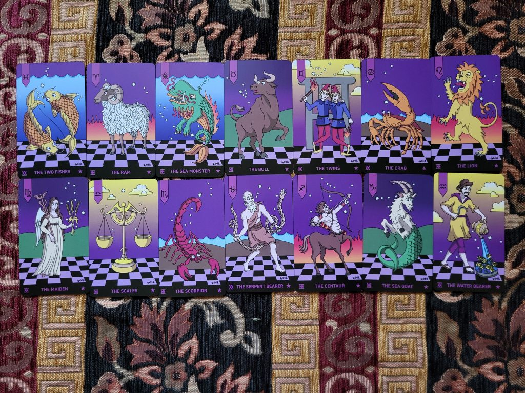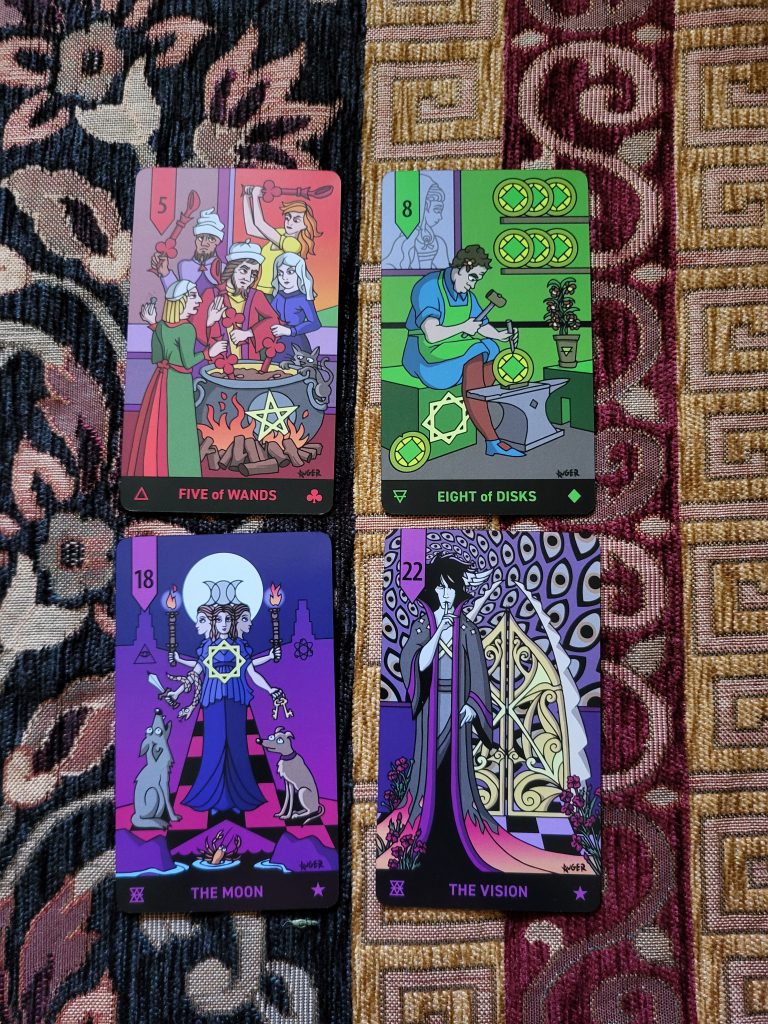 As I wanted to delve right in and look through all the cards, I noticed they are very playful yet relatable to what you might see in a Rider Waite Smith deck. However, as an example, the 5 of Wands has a depiction of too many cooks in the kitchen showing how things can be disrupted if you don’t all work together. The 8 of Disks does have a man hard at work, yet there is a plant that grows, and for anyone familiar with the Thoth, you will recognise it as Prudence. The Majors are based on a chess board and mostly have black and purple tones to them, as do the zodiac cards. The Moon has the Triple Goddess standing at a crossroads between subconscious and celestial realms whilst being the gatekeeper of the middle world. Card number 22, titled Vision, depicts Morpheus the King of Dreams. Here we have a message that talks about “The borders of our minds and memories are ever shifting and can flow into greater collective energy evoked by symbols.” Therefore we need to pay attention to the visions we have upon dreaming. I love how both those cards are similar yet look so different.
