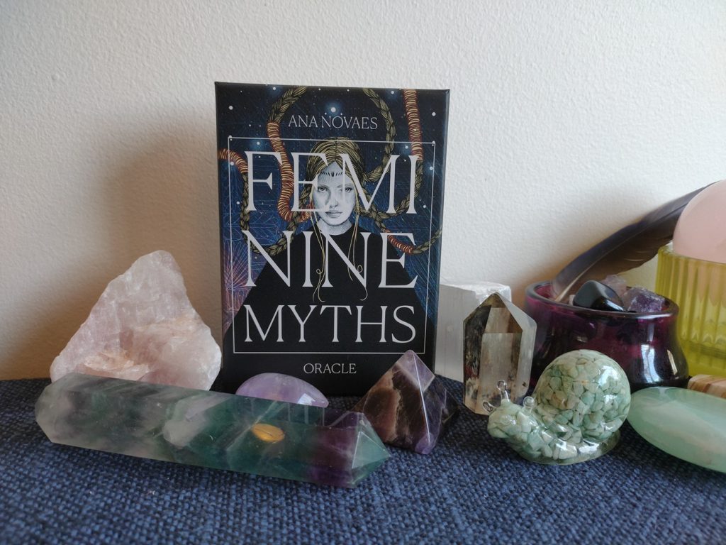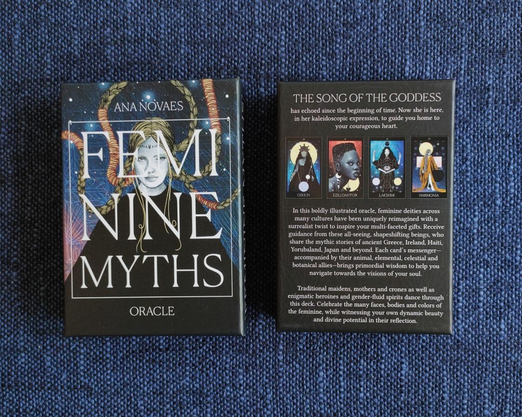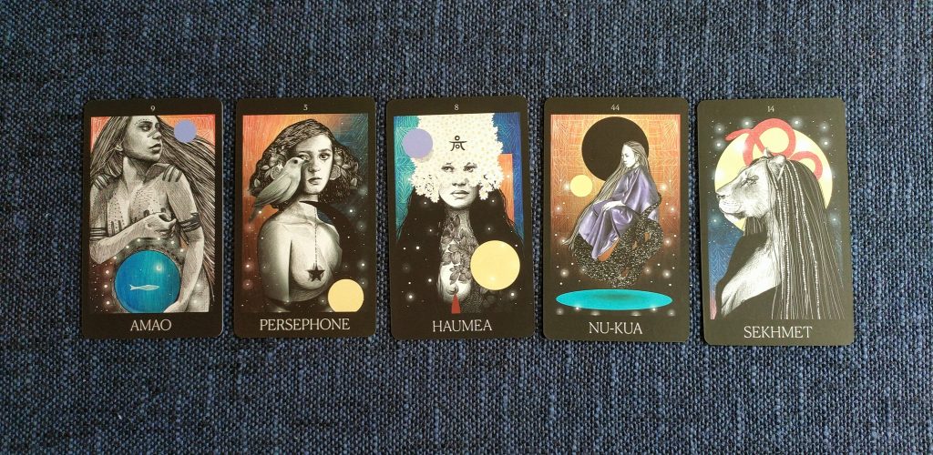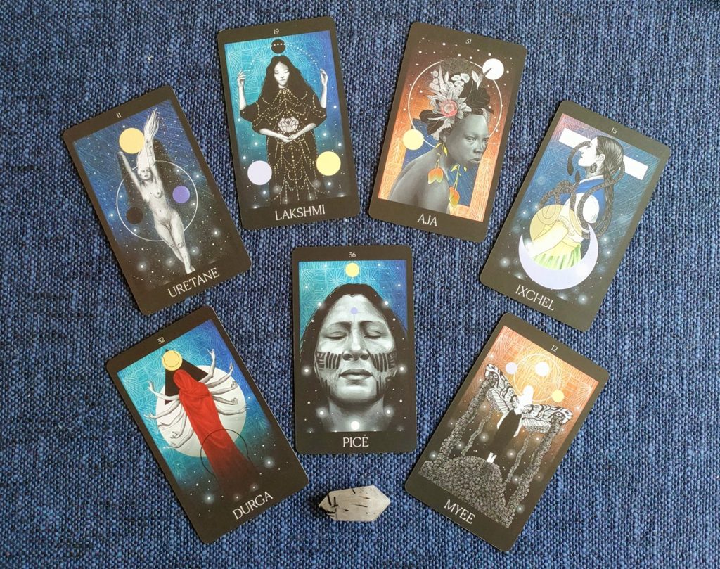 Ana Novaes’ new Feminine Myths Oracle Deck published by Blue Angel, explores female deities from around the world. The representations are fresh and contemporary, setting it apart from the many other God and Goddess decks on the market. Each goddess feels human yet otherworldly. Novaes explains in the guidebook that she wanted to capture the personality and relatability of every goddess in the moment before they become myth (p.11). Myths from cultures beyond Greek and Roman mythology are brought to life in this deck. Hindu Lakshmi represents material and spiritual wealth. Mayan Ixchel is linked to the keyword ‘Incubation’ and is associated with the moon and pregnancy. Aja, the woodland spirit of forests and animals from the Yoruba Orisha mythology, tells us to be patient during challenging times. Uretane has both male and female reproductive parts according to South American myth. “Vulnerability” is her keyword because she overcomes embarrassment of her body to ask a woman to marry her. It is the artist’s intention that the cards embody “age-old stories that teach us how to live today” (p.11). By using this deck myths can help us understand our everyday reality.