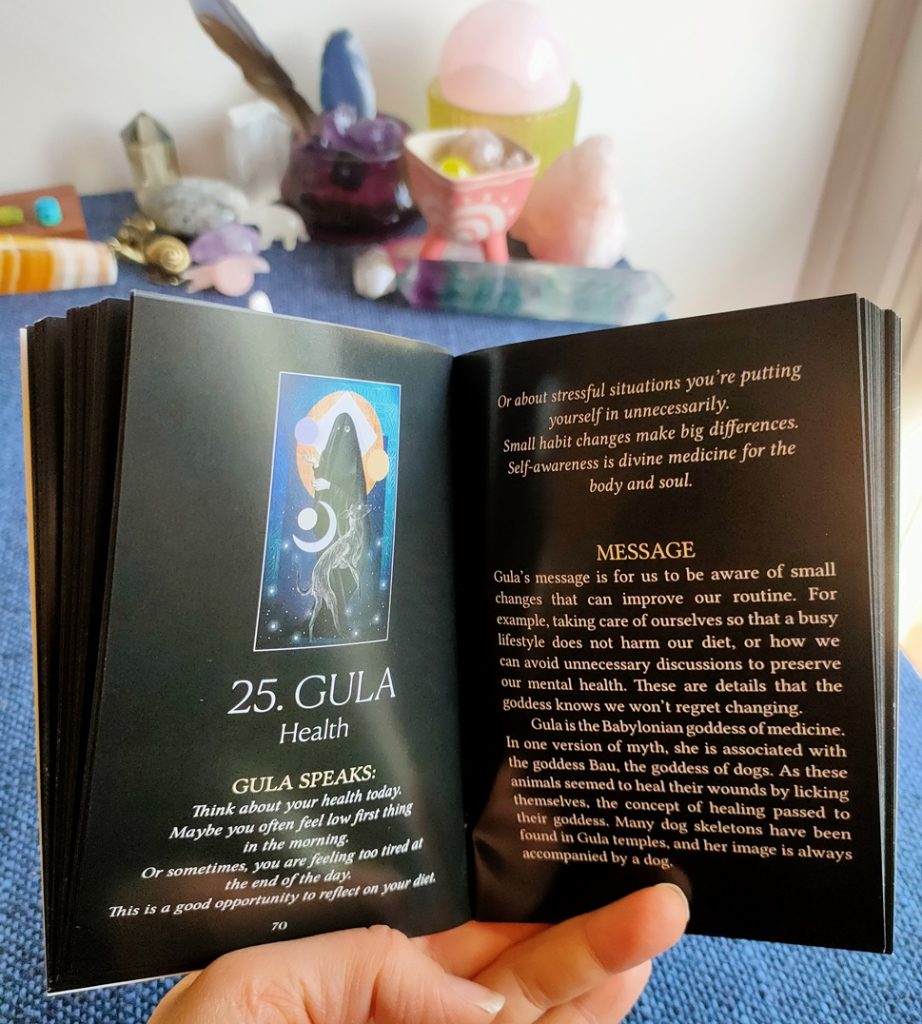According to the blurb on Blue Angel’s website, each Goddess has a plant or animal symbol on the card. There is no particular reference to this in the guidebook, so I did a bit of my own reading for a few of the more unusual cards. Card 25, Gula (also known as Ninisinna or Ninkarrak) is a Goddess of medicine, healing, creation and destruction worshipped c. 2000-1750 BCE. in Mesopotamia (modern day Iraq). Gula’s companion and symbol is a dog, which represents the power to heal. Novaes depicts Gula wearing a Burqa style covering. In the British Museum there are representations of Gula on a seal wearing a star topped square hat and a long gown which looks like the intricately embroidered clothing worn for traditional festivals in some parts of Iraq. If you are interested, it is worth comparing the ancient representations of the Goddess with Novae’s version. I am curious to know how Novaes approached the research and design of each Goddess card – why she chose certain symbols and clothing, and who the models are that she drew for each one.