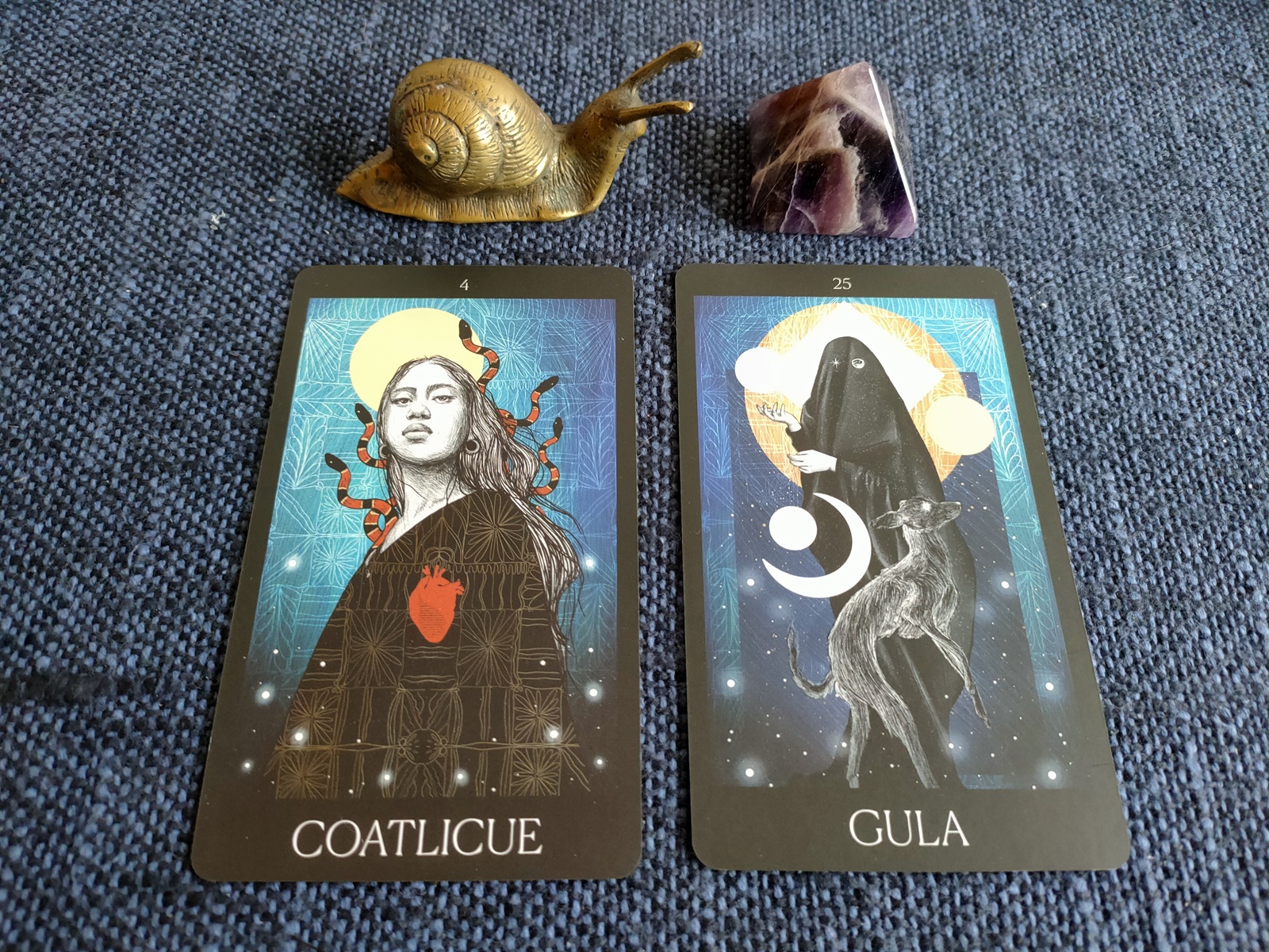 Coatlicue is the Aztec Goddess represented on card 4. An impressive stone statue of this Goddess was unearthed in Mexico around the 18th century. It now resides in the National Museum of Anthropology in Mexico City. Comparing the statue with Novae’s oracle card, the former is fang-toothed, snake headed and menacing, while the latter looks defiant yet approachable. The statue wears a skirt of snakes and a necklace of human hearts, skulls and hands. Novaes’ contemporary Goddess wears a human heart on her chest and snakes emerge from behind her. Coatlicue is the mother of the sun and moon gods and represents life and death, creation and destruction. Like the earth, she feeds on decayed things in order to create new life. After reading a little about the myth of this Goddess, I am not entirely sure how the artist decided on the message of ‘self-care’ for this card. Perhaps she is thinking more of this character as a mother figure who nurtures. The myth of Coatlicue reminds me a lot more of the themes of endings, transformation and creativity embodied by the Death card in the Tarot. However, overall I think most of the messages and myths in the guidebook relate well to the images seen on the cards.