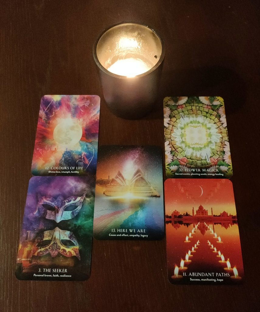 I must confess straight away that I am not typically attracted to decks made with digital illustrations because the art sometimes looks cut-and-paste and superficial. Digital art has fast become part of the standard visual language for oracle decks, so I am rather selective about what I choose to use. Despite my initial reservations, I find Selena Moon’s artwork for this deck well considered. The foundation images are constructed around photos of familiar things, like the Sydney Opera House on Card 13. “Here we are”, but then transformed seamlessly into something ethereal and creatively sophisticated. It was not until I lined up some of the cards to photograph them for this review that I realised they glow due to the vivid colours and use of moon, constellations and fire imagery.