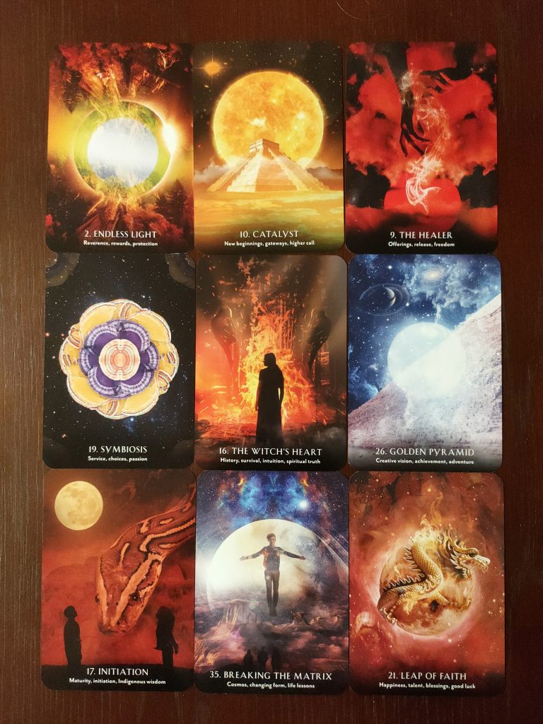 The deck is inclusive in that it encompasses a spectrum of rituals from around the world. People are sparingly represented in the deck. Instead, symbols, objects, colours, and buildings are the emphasis making it a deck that most people could use and relate to. I have been drawing a card from the Ritual Earth Oracle for final advice after a tarot reading, and the messages in the guidebook have been on point every time. The guidebook includes an explanation of how to use the cards, cleansing rituals, plus it has four tailor made spreads. The most interesting suggested use for the oracle is the “Energetic Home” spread. Lay out a card to represent every room in your house, or every level of your apartment. Each card drawn reveals the energy of that room, whether it is yours or residual from previous tenants. The spread can help you cleanse energy and Feng Shui your furniture in your house. Using an oracle deck as a means to assess the impact of space on your habits or feelings, is an approach I have never considered before and I find this so inventive. It makes perfect sense since there are many studies on the impact of our environment on how we behave, think and feel.