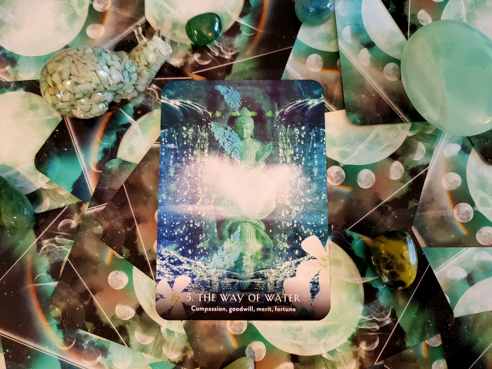 I appreciate Selena Moon’s ability to use colour to convey the meaning and emotion behind the ritual depicted in the card. The photographs are not used descriptively – they capture the essence of that place, the people, or the intention of the event. Card 12: “Colours of Life” is a typical example. At first glance the card looks like a moon bursting out of a multicoloured sky. On closer inspection the sky is in fact crowds of people celebrating the divine ‘Holi’ festival in Nepal and India. People gather to spray coloured water at each other to signify the end of winter and the start of Spring, and it is held on the last full moon day of the Hindu calendar. Selena has used discretion and research to pick the key symbols or images that encapsulate the message for each card.