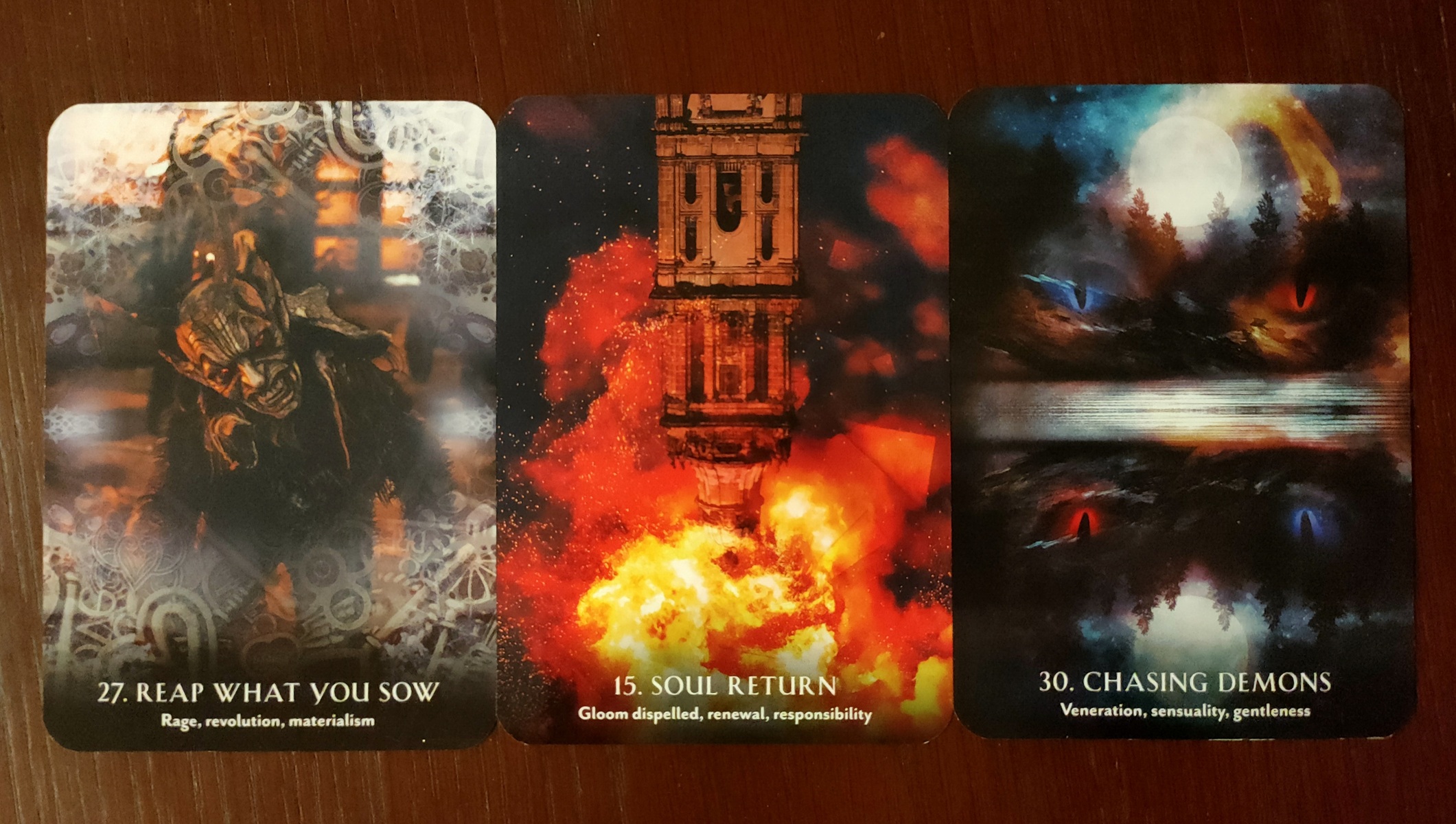 What I appreciate about this deck is that the cards are not all light and cheery. In fact there are many that look sinister and dark, because rituals in many cultures are about warding off evil spirits, demons or energies. Card 15: Soul Return (gloom dispelled, renewal and responsibility) immediately reminds me of The Tower card from the Tarot. The message is candid: “Down crashes the tower of doom and gloom. You must not stand for this kind of negativity in your life”. The ritual for this card is Burning of Zozobra, USA in which a 15m effigy stuffed with divorce papers, old photos and letters from the community is burnt, with the intention of cleansing away negative energy. The personal ritual invites you to declutter your old paperwork, bills and things that are feeling a burden in your life. Card 27: “Reap what you sow” (rage, revolution, materialism) looks really scary first thing in the morning before a coffee, but the card is all about keeping check of your vices so they don’t get out of hand, much like The Devil card in the Tarot. The card depicts the legend of Krampus who was St. Nicholas’ evil counterpart who would beat naughty children with sticks before carrying them away in his sack to the underworld. Much more sinister than just leaving a lump of coal on your doorstep! Krampusnacht is celebrated on the 5th of December in some parts of Germany and Europe and is a festival where people dress up like Krampus to scare away bad vibes.