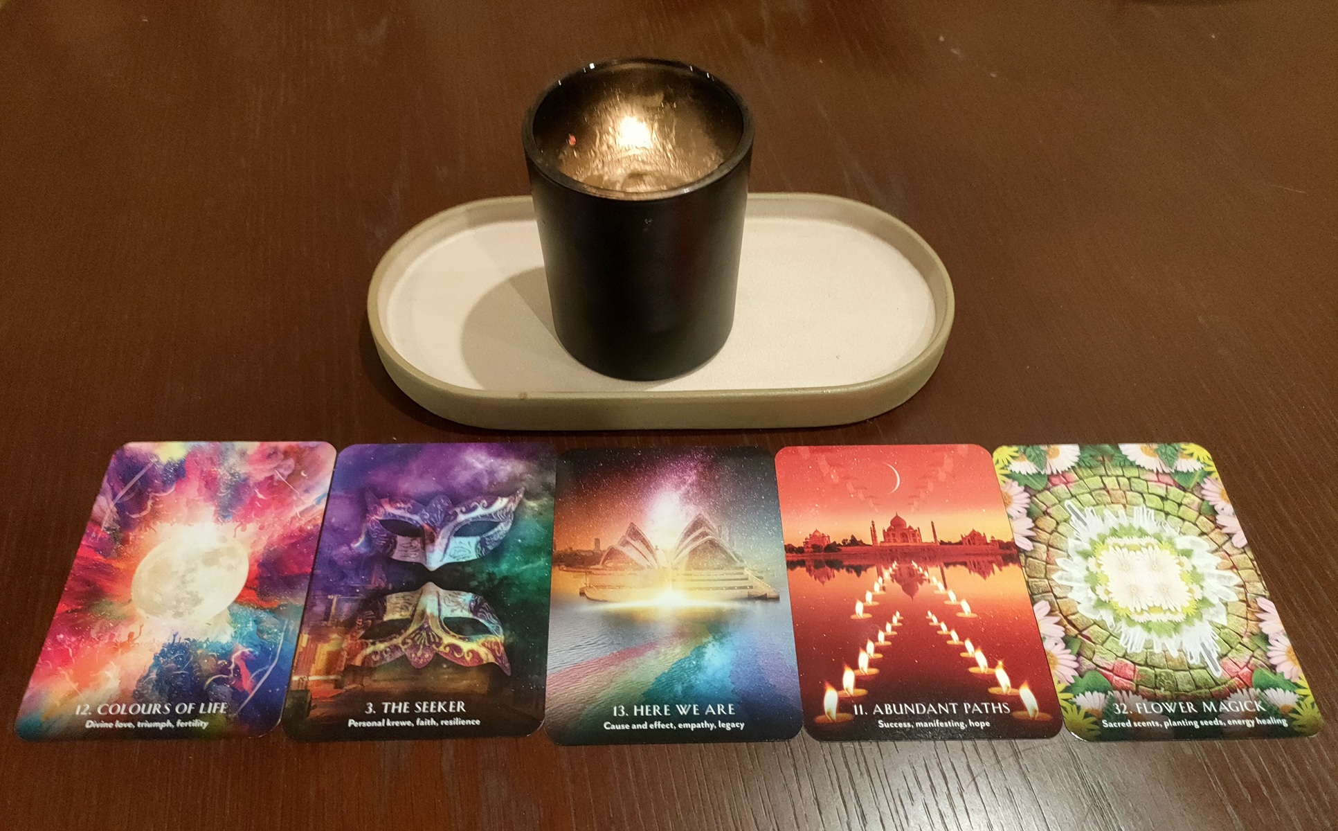 I must confess straight away that I am not typically attracted to decks made with digital illustrations because the art sometimes looks cut-and-paste and superficial. Digital art has fast become part of the standard visual language for oracle decks, so I am rather selective about what I choose to use. Despite my initial reservations, I find Selena Moon’s artwork for this deck well considered. The foundation images are constructed around photos of familiar things, like the Sydney Opera House on Card 13. “Here we are”, but then transformed seamlessly into something ethereal and creatively sophisticated. It was not until I lined up some of the cards to photograph them for this review that I realised they glow due to the vivid colours and use of moon, constellations and fire imagery.