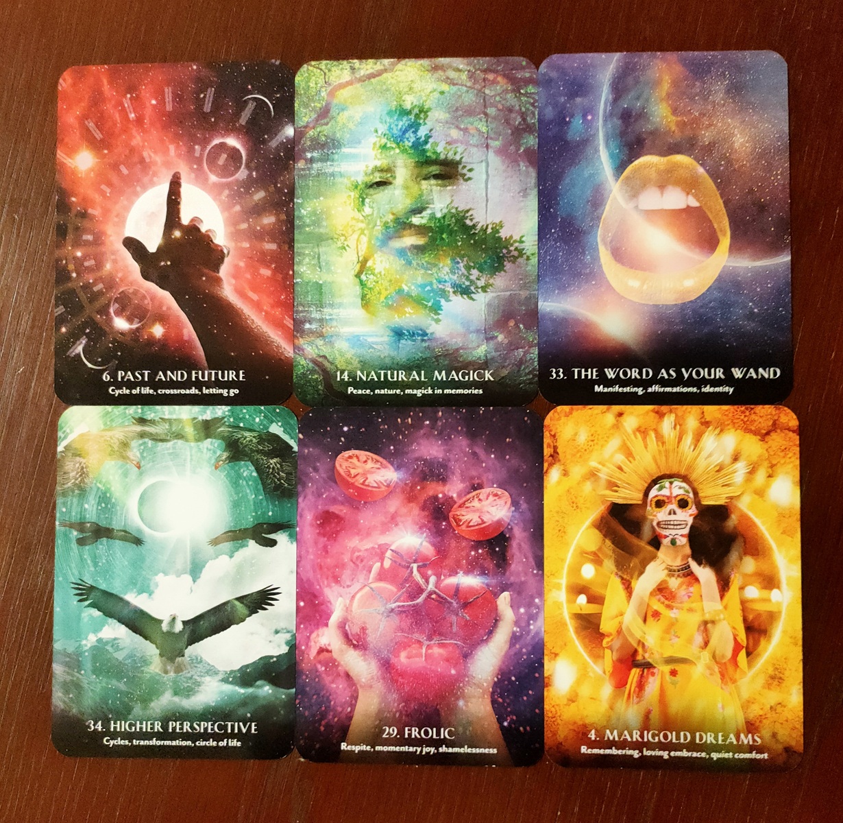 The card stock is glossy (I usually prefer a satin finish), however it is well chosen for this oracle because the finish amplifies the colours in the deck. It is very easy to shuffle, although a little slippery. The 36 cards each measure 9 x 13cm which is a bit wider than a playing card, but still easy for small hands, and the edges have silver gilding. The box is compact to fit the deck exactly and has a snug removable lid. The size of the box makes it portable, and is smaller than a typical Rockpool oracle deck. I actually like that there isn’t any extraneous packaging.