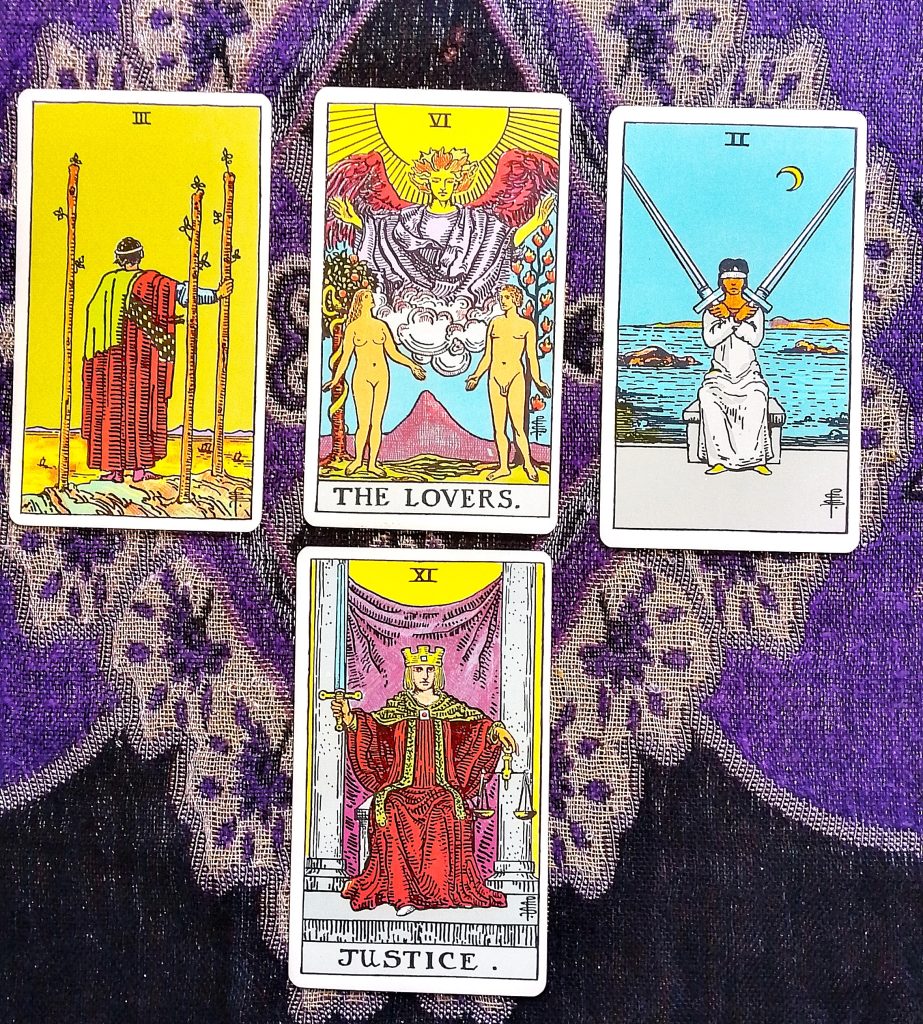 As a point of interest, if you are using a Rider Waite influenced deck, when you use this spread, have a look at which way the characters on the Cards are looking as this often gives an extra layer of interpretation. For example, in the photograph, Card 2, the 3 of Wands has his back to us, Card 3, The Lovers look at each other, while both the 2 of Swords, Card 4, and Justice, Card 1, look towards us, although of course, the 2 of Swords is blindfolded!  A suggested interpretation could be that someone has turned their back on the situation, someone has turned a blind eye to something and yet there is the need for the situation/matter to be faced head on.
