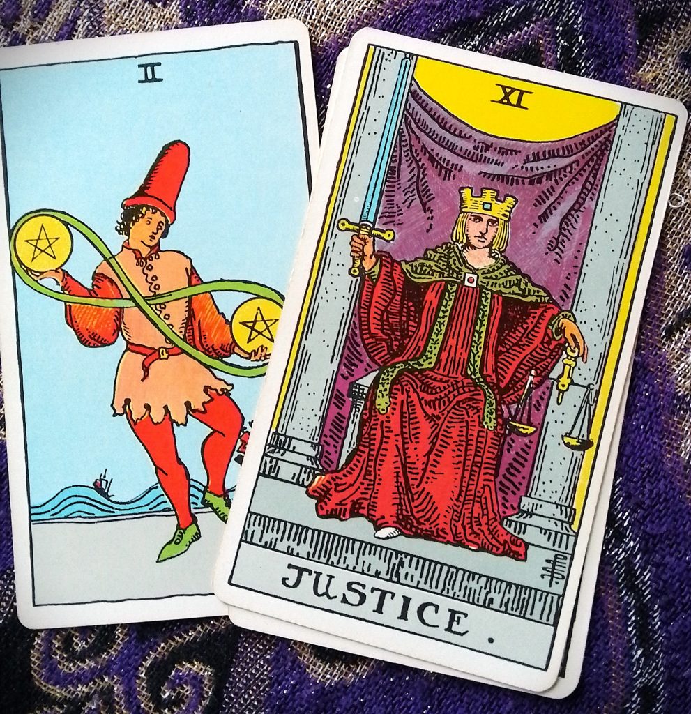 Turning then to the final two, Cards 21 & 22, these are laid face down so as not to influence the messages from the other Cards. They are generally seen as the Final Message/s of the reading and very often re-enforce the overall theme or feeling of the spread.  In the photo, these were the 2 of Pentacles and Justice.