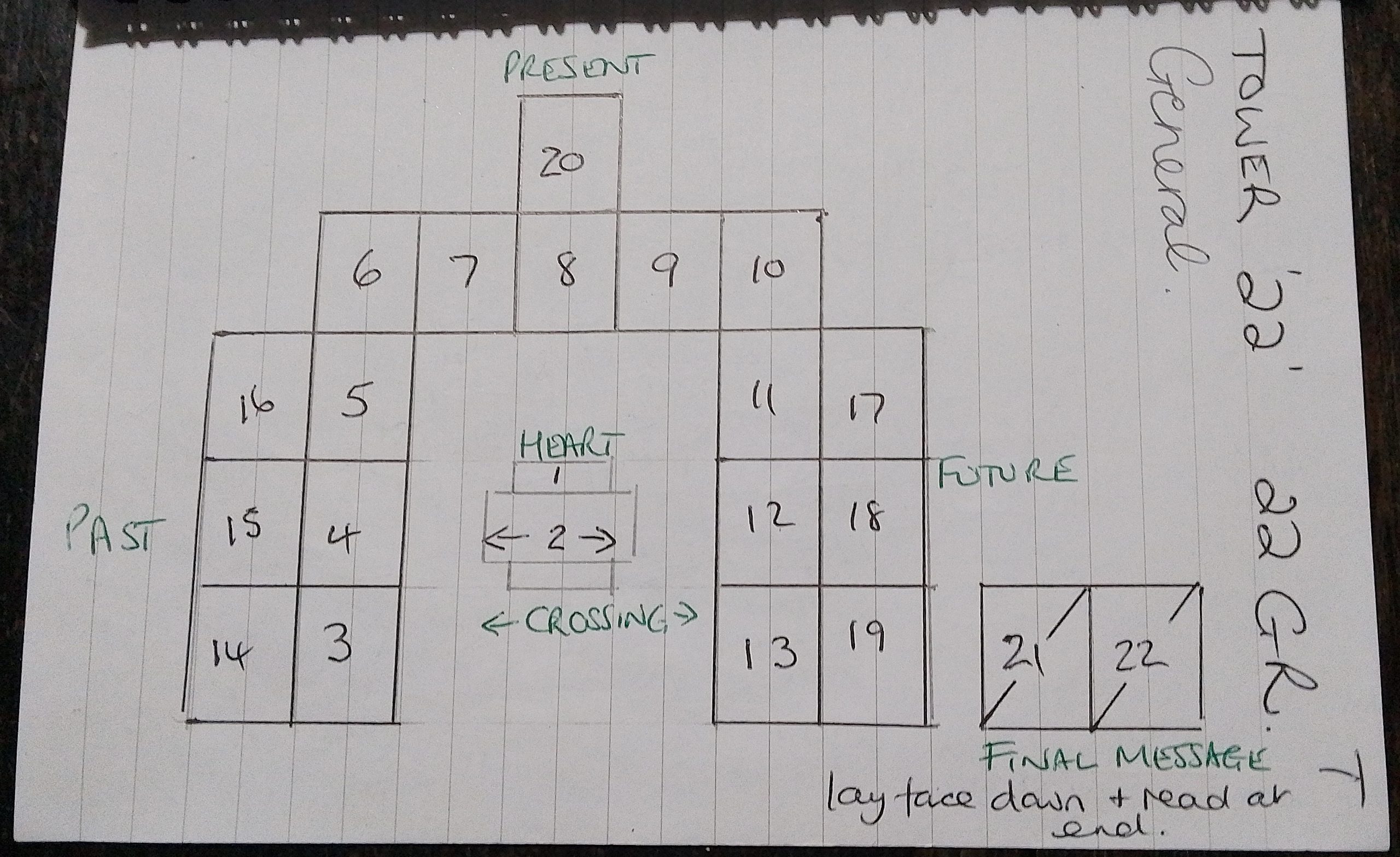 The Tower uses 22 cards and is basically a Past, Present and Future spread but there are interactions between the cards. In the centre are placed Card 1, the Heart or core of the matter and Card 2 (crosswise), what is crossing or obstructing the matter.  These two Cards are read first.