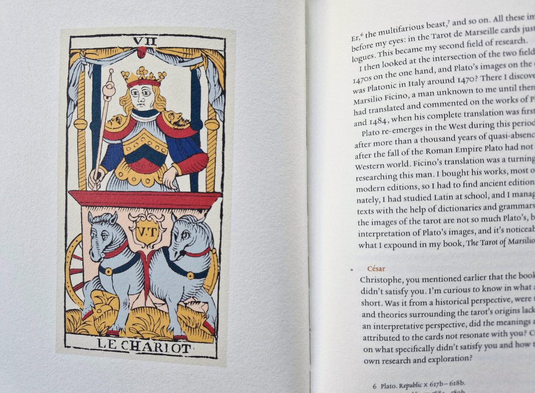 Plato’s chariot of the soul, for instance, is obviously reflected in the Chariot card of the Tarot de Marseille, in a spectacular way. […] I thus identified many Platonic myths and images in the Tarot de Marseille cards: Plato’s cave, the divine procession of the Myth of Er, the multifarious beast, and so on. (p.4, 9)