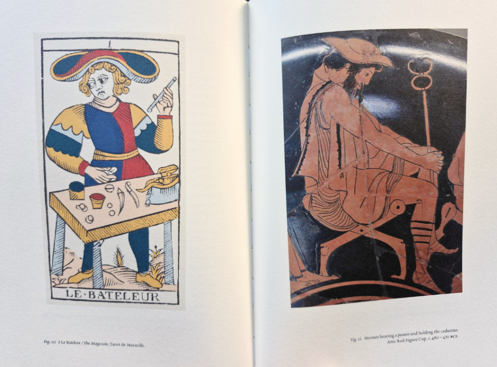 In the Magician card the conjuror has a flat wide-brimmed hat […] it is the typical hat of the pagan god Mercury, the petasos, and like him, the character also holds a wand. (p.81)