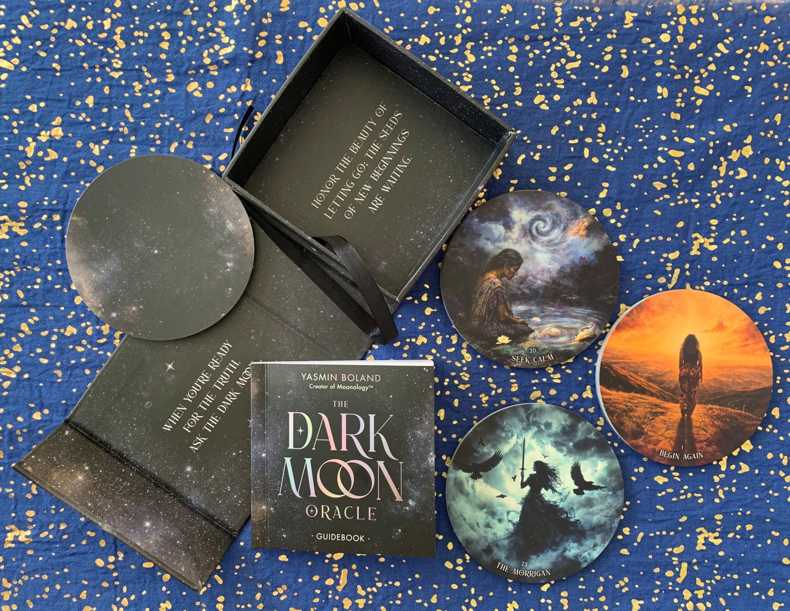 The deck arrived in a dinky (but sturdy) 11cm x 11cm x 4cm (4½ x 4½ x 1¾ inch) black box, which opened out to reveal a set of round cards and a guidebook. Inside the lid of the box is the inviting phrase “When youre ready for the truth, ask the Dark Moon,” and upon lifting the cards out of the box another message: “Honor the beauty of letting go; the seeds of new beginnings are waiting.”