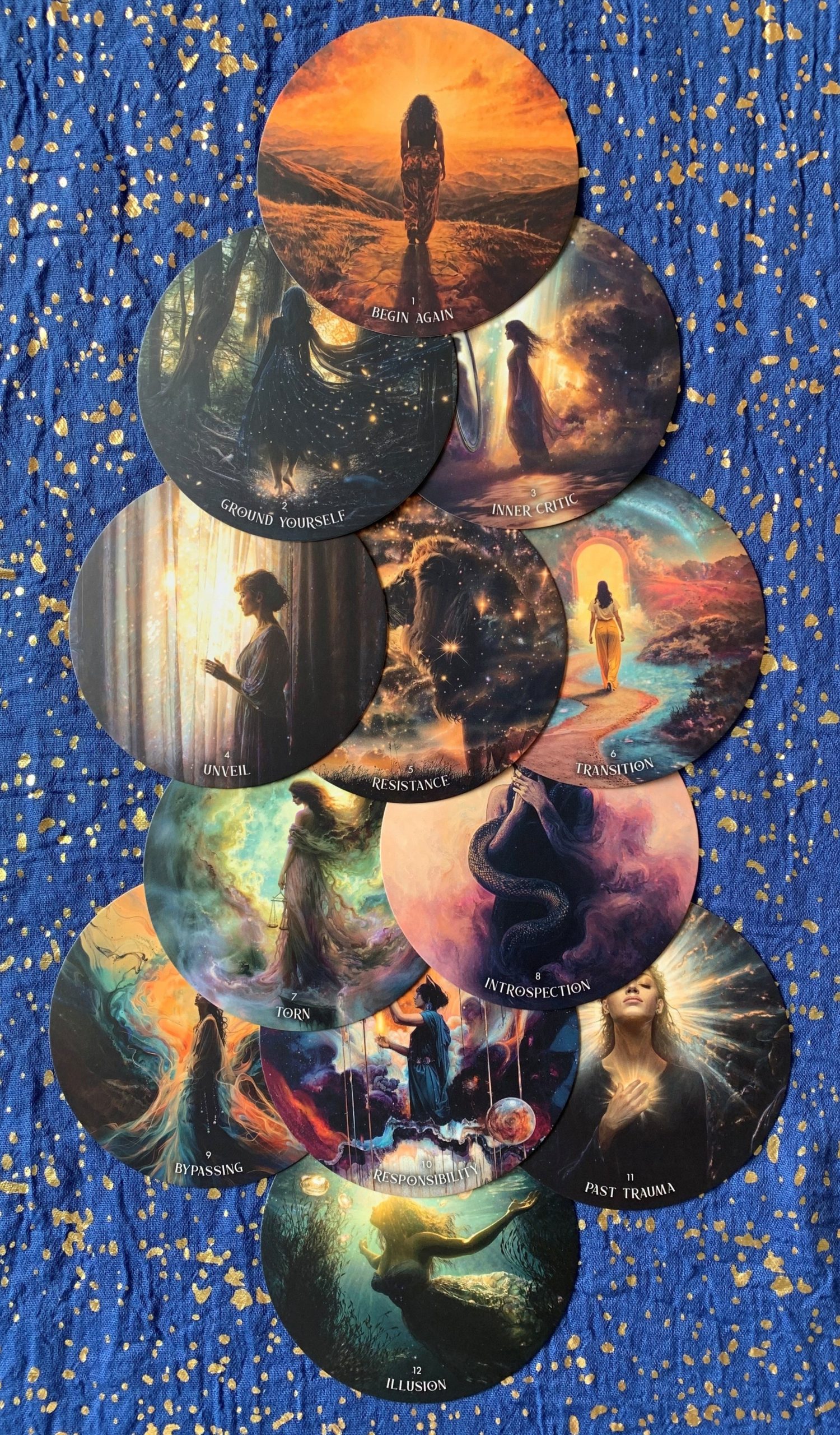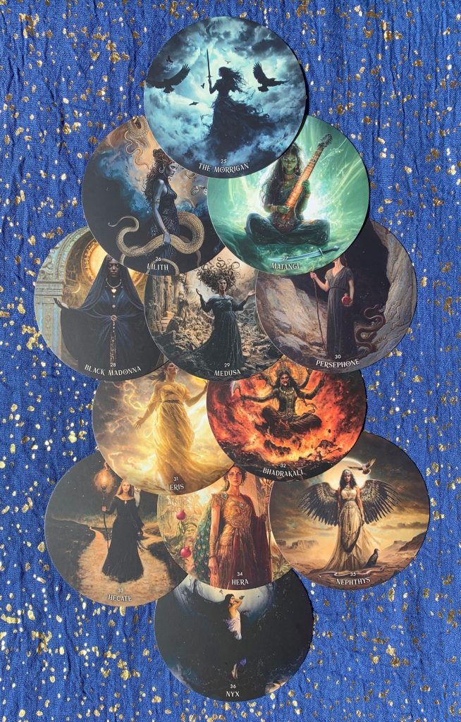 Cards 25 – 36 take us through The Dark Goddess Suit. Again, these cards follow the 12 Zodiac signs with the focus of stepping into your own power and recognising your ability to shape your own reality. They reflect both the positive and darker sides of the Zodiac signs, recognising that the darkness is just as important as the light, and they invite us to balance and transform those energies.