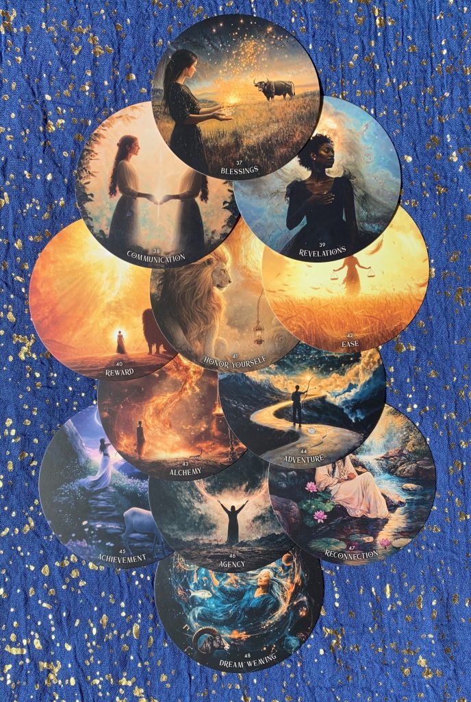The final card in the deck, Card 48, Dream Weaving, follows the transition of the Dark Moon from Pisces, ahead of the New Moon in Aries, and is about balancing dreams and action, making an effort, and turning a corner. It’s a card of re-birth, and with it the deck has come full circle.