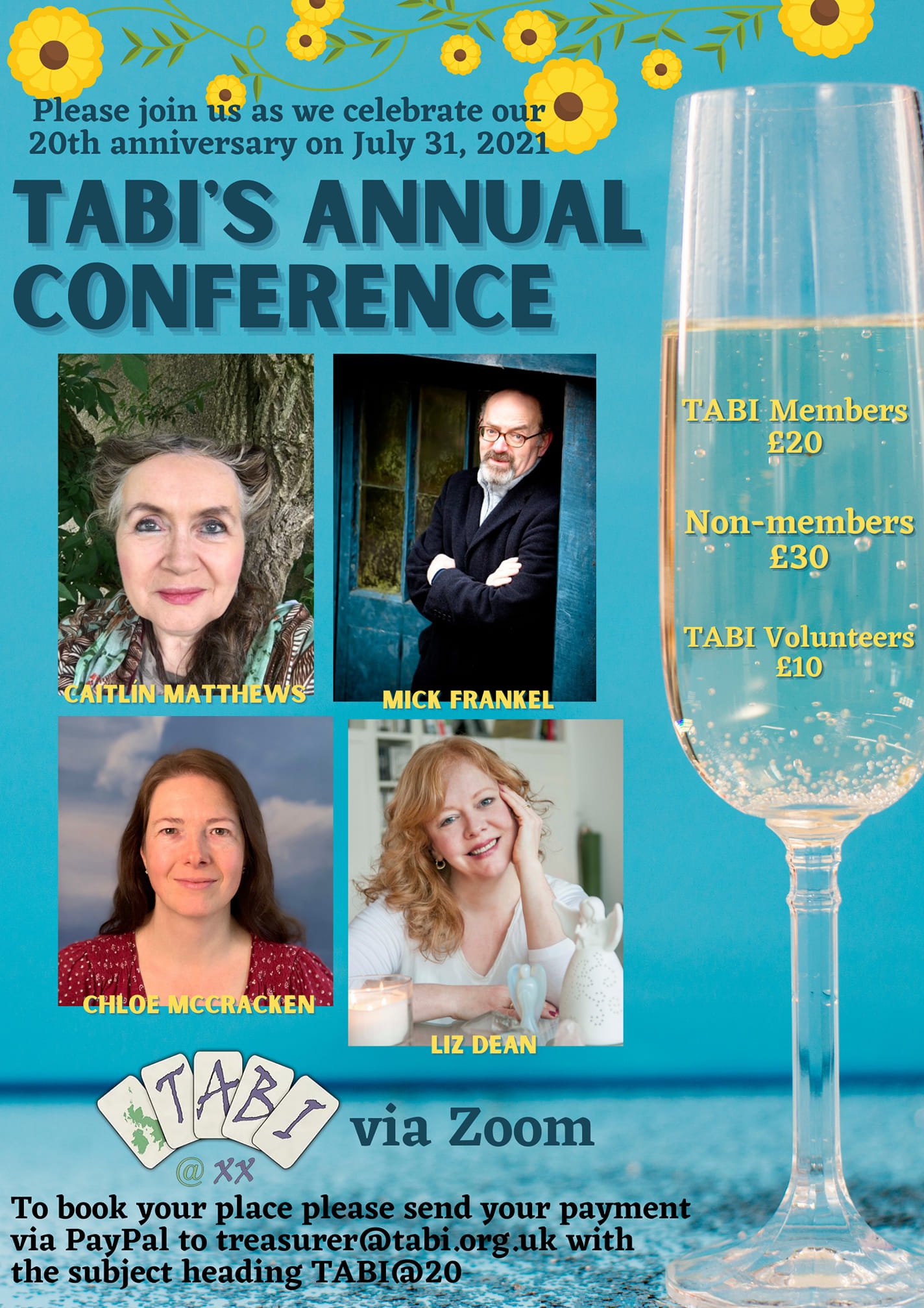 Speakers: Caitlin Matthews, Liz Dean, Chloe McCracken, and Mick Frankel Please visit the Conference pages for the Speaker interviews! The interviews include details of each presentation. Ticket Prices – £20 for TABI members, £30 for non-members, £10 for TABI volunteers Payment – Please send your payment via PayPal to: treasurer@tabi.org.uk Read more